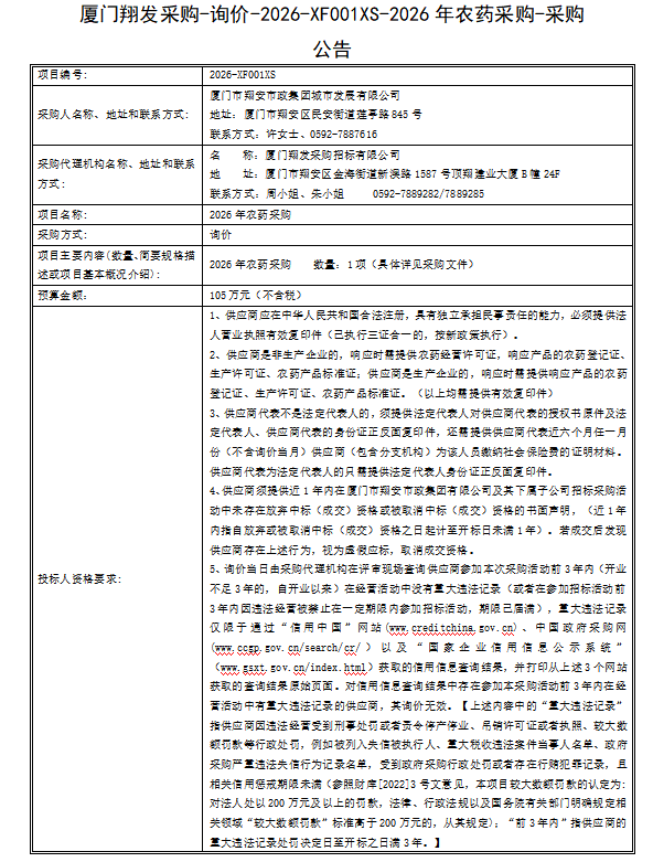 厦门翔发采购-询价-2026-XF001XS-2026年农药采购-采购公告